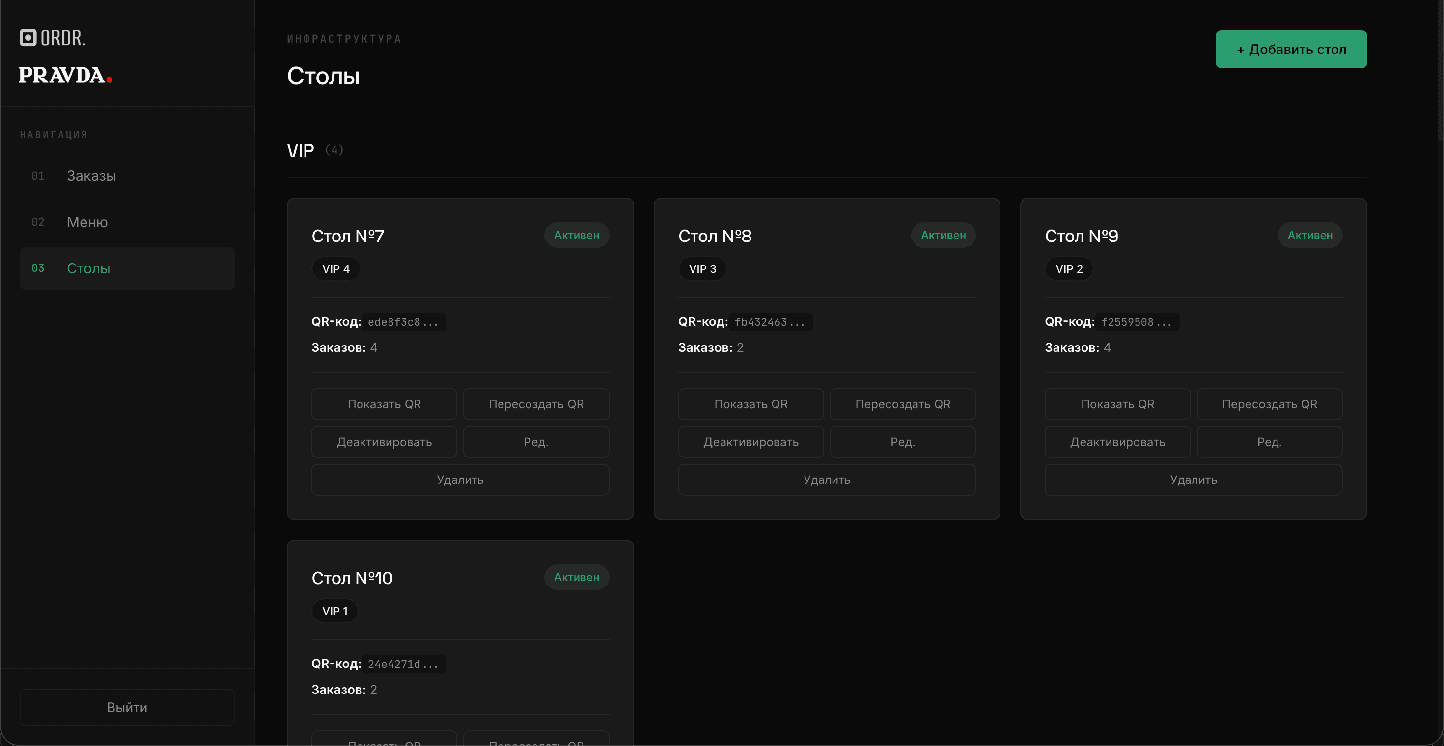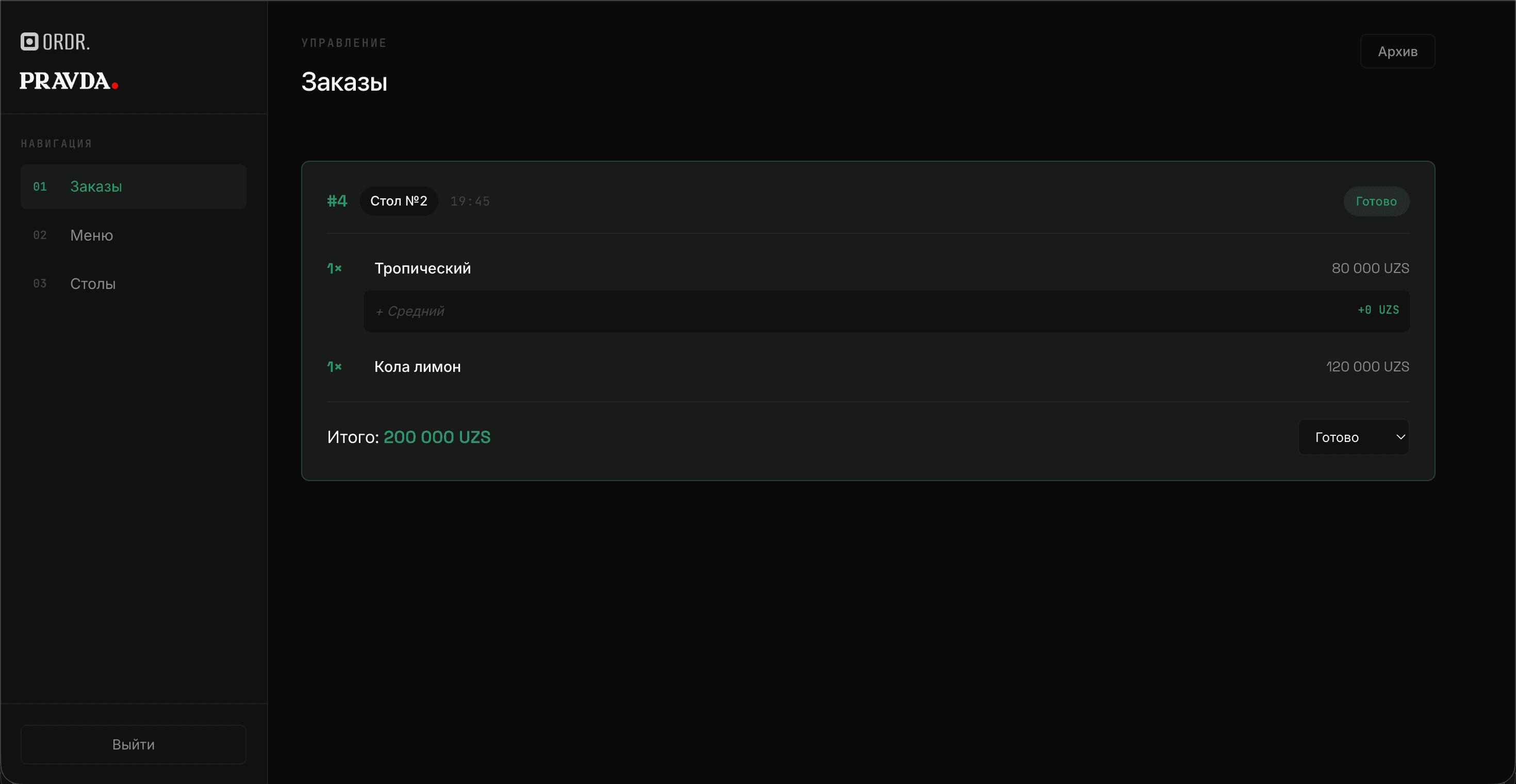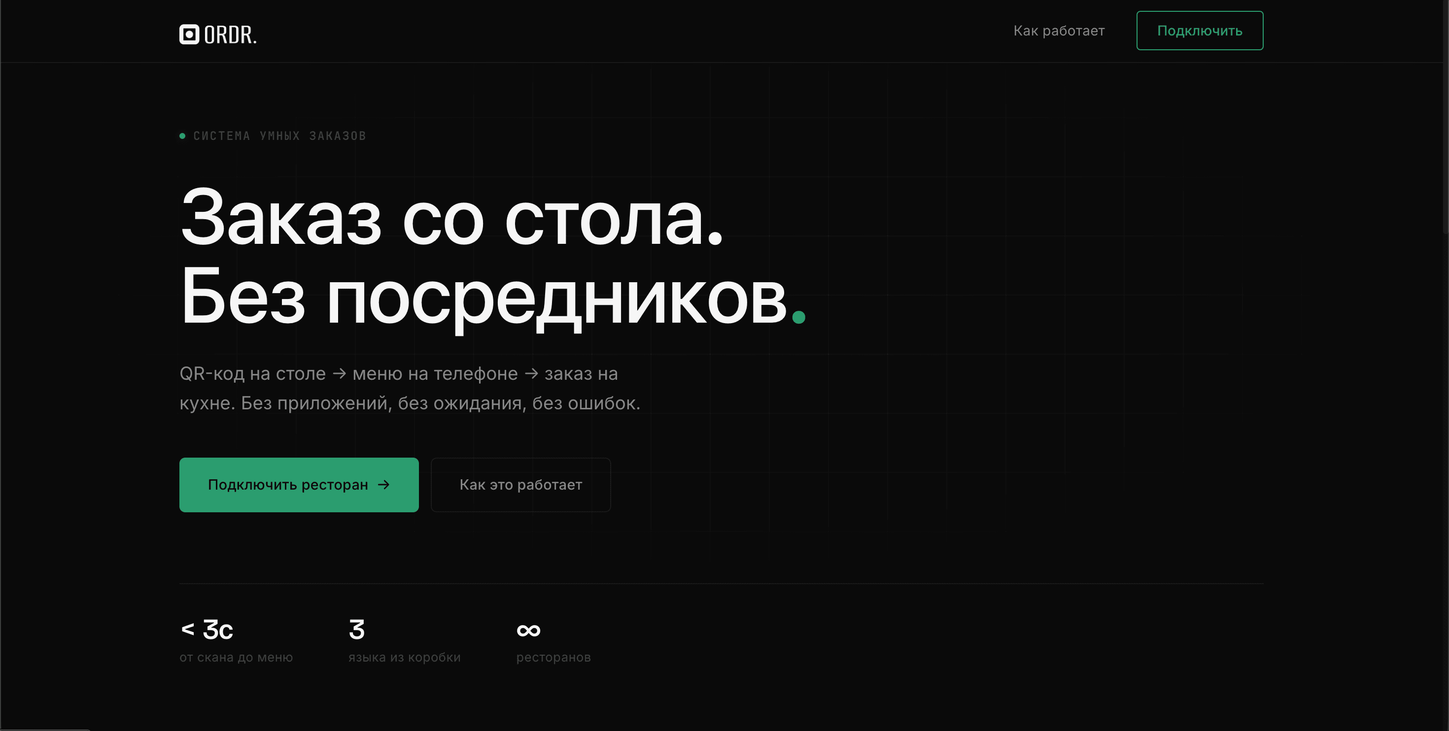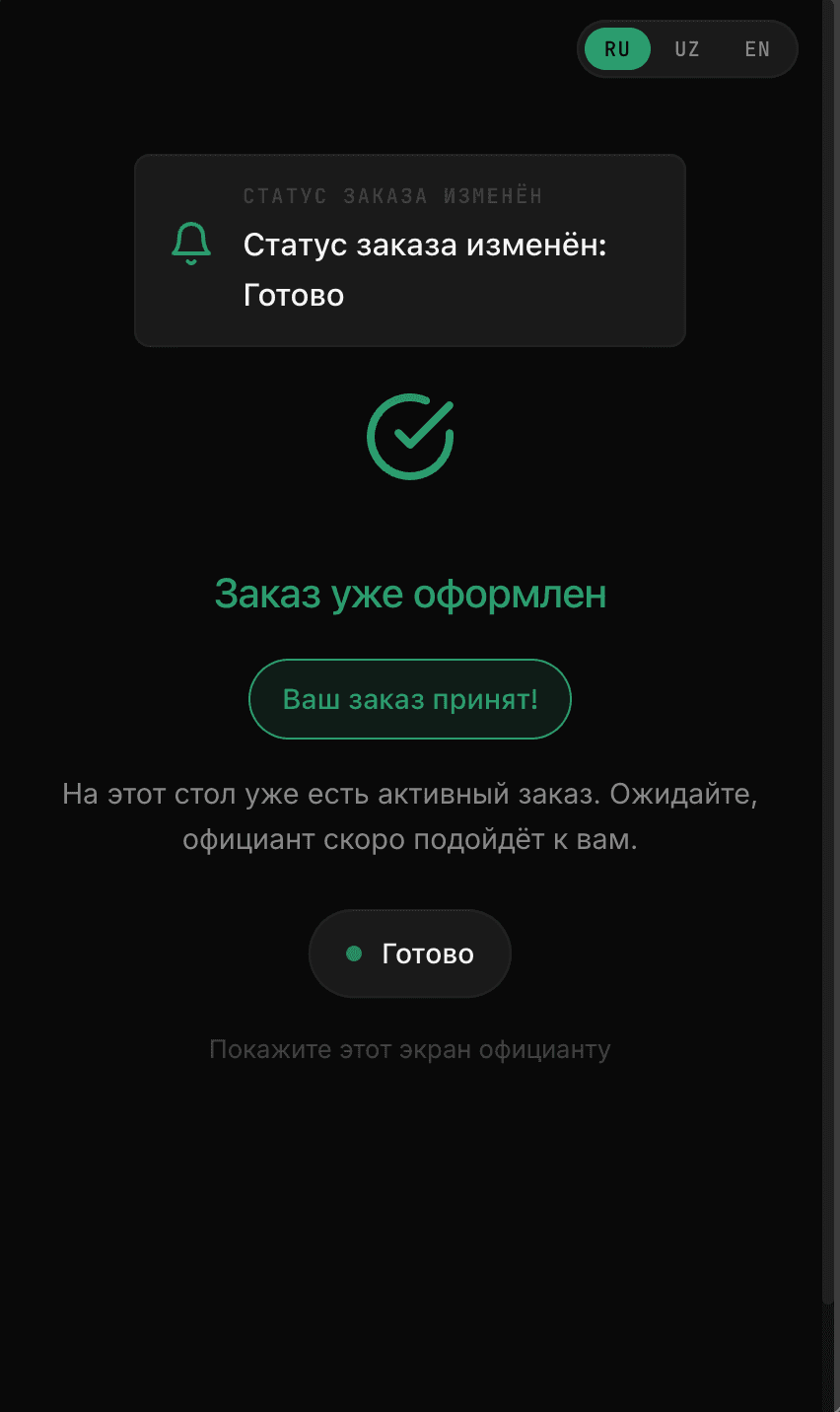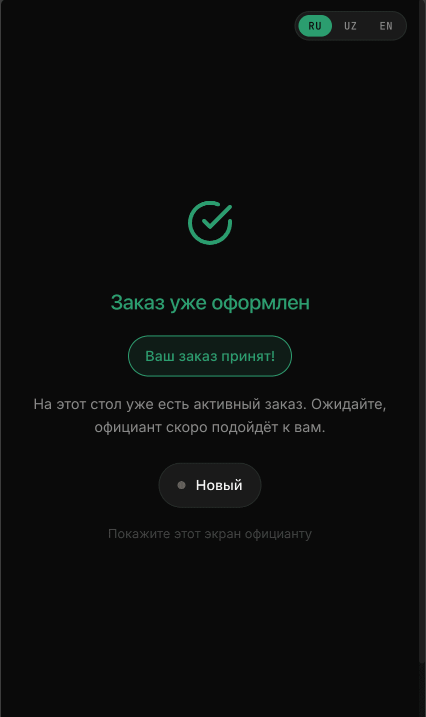 ordr.uz is a multi-tenant QR-code digital menu and ordering platform for restaurants. Each restaurant gets its own slug-based URL, a customer-facing menu, and a full admin panel. Customers scan a QR code on their table, browse the menu, configure option groups (size, extras, etc.), and place orders that appear in real time in the kitchen. The platform supports three languages — Russian, Uzbek, and English.