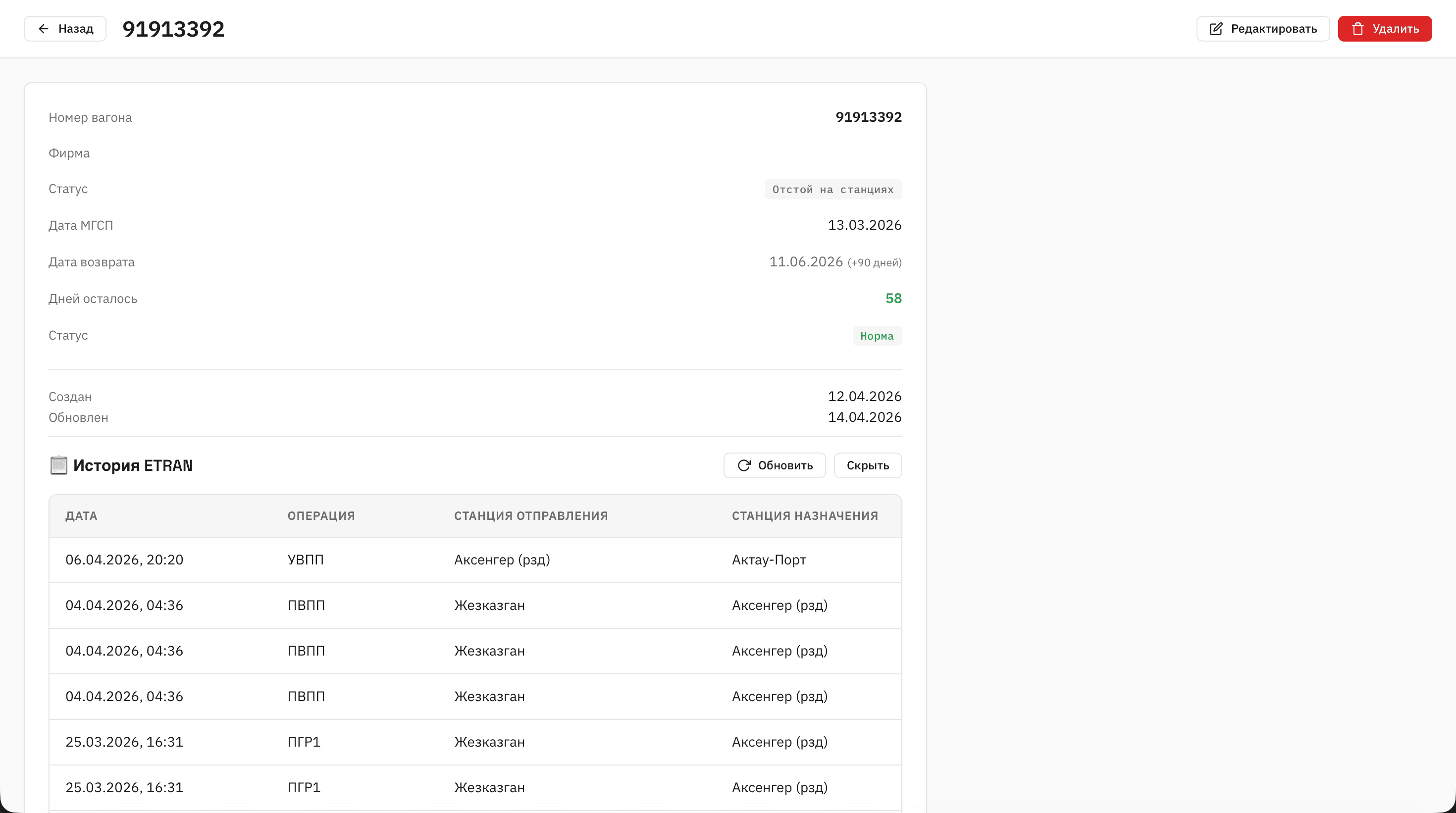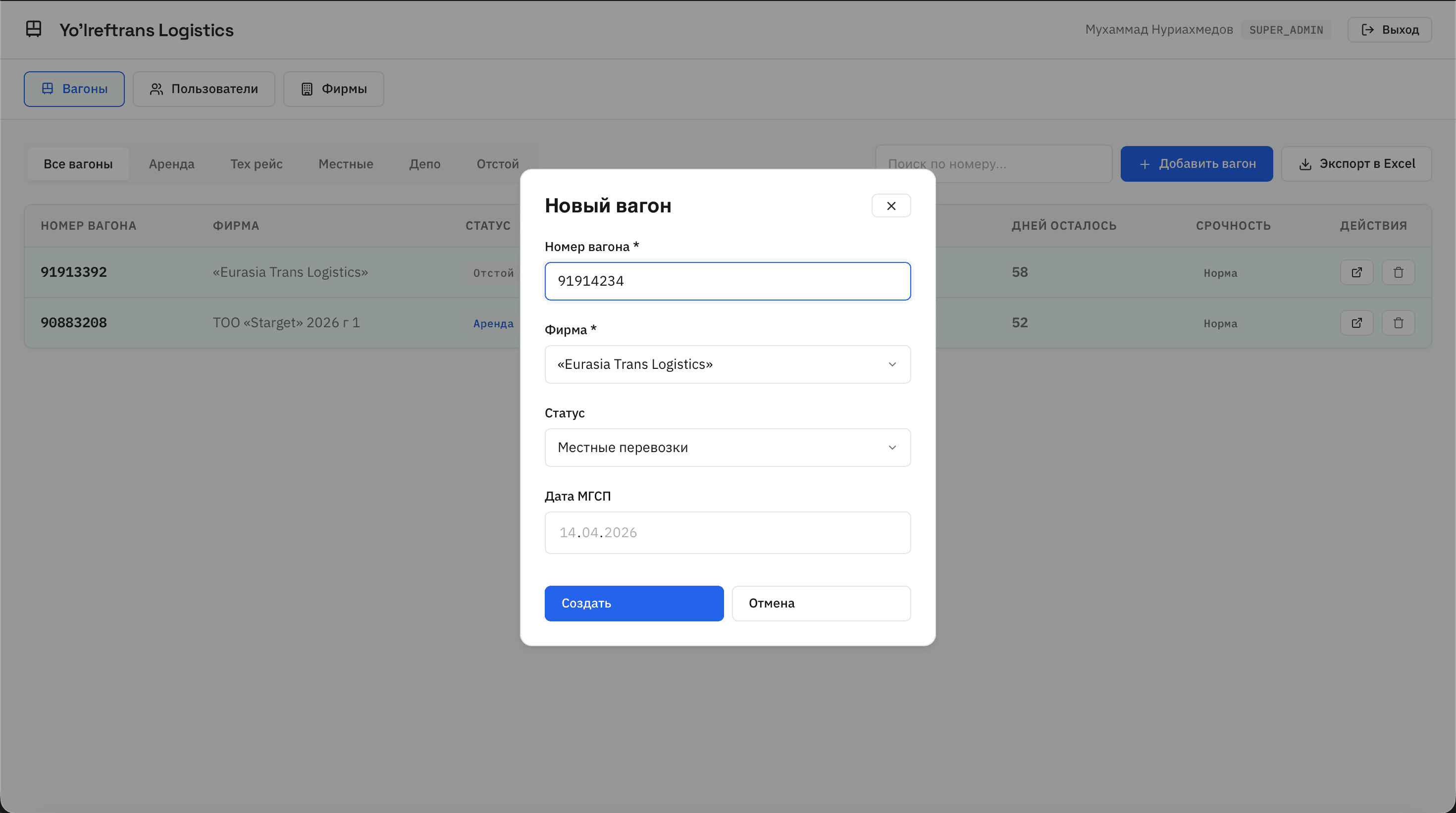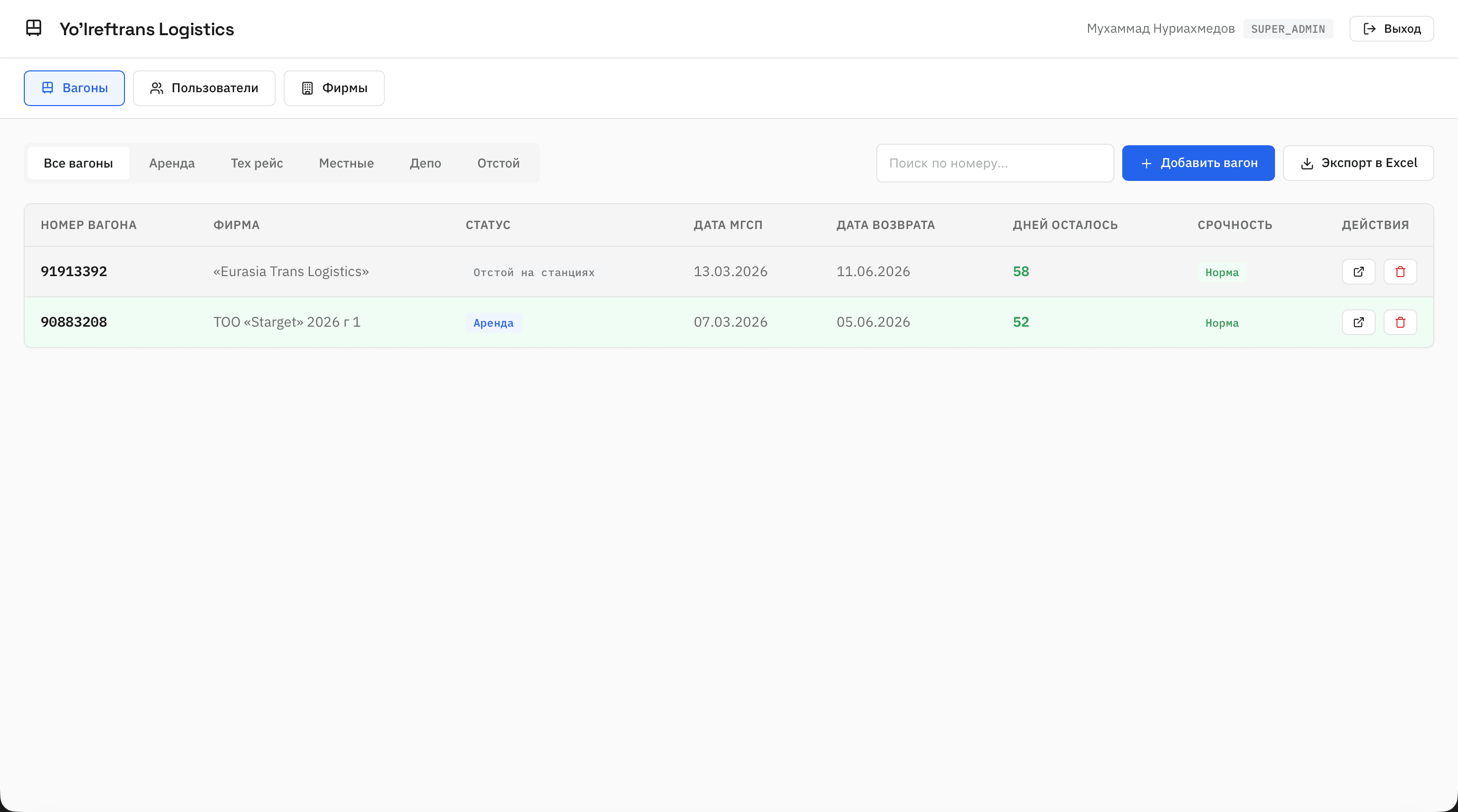 A comprehensive logistics platform for Yo'lreftrans, an Uzbek railway operator. The system tracks freight wagons, rental companies, current locations, and return deadlines. It was built as a NestJS backend, a Tauri/React desktop app for managers, and a React Native/Expo mobile app for field workers.